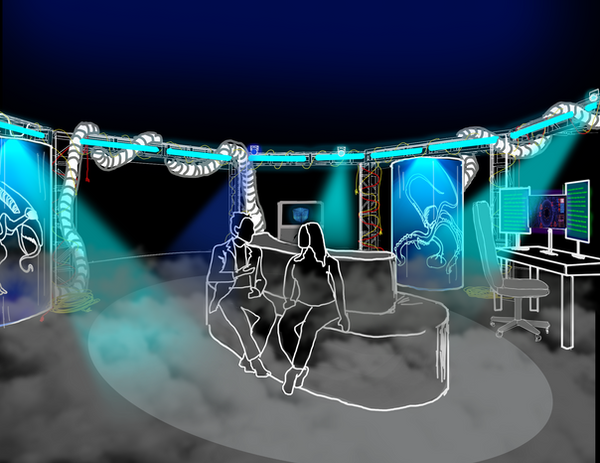 The journey extended outdoors to a reconstructed crash site, replacing the pool with a cinematic debris field that anchored the narrative in a tangible moment of impact. Deeper within the experience, a live specimen containment area introduced evolving performances and real-time experimentation, ensuring the environment remained dynamic throughout the night.